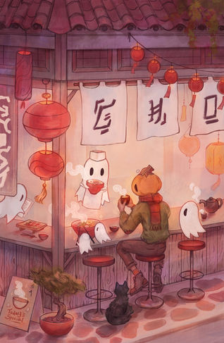 Unlike what many humans believe, the ghosts in Mr. Pumpkin's forest aren't the spirits of people who have passed away. Instead, they're the remnants of wishes and dreams that never came true. The ghosts gather in the ghost village to bring these wishes to life, such as running bakeries and bookstores or having a family.